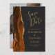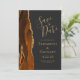 Den här eleganten är modern när du sparar datumkortet och har en bränd orange vattenfärg som agerar geode gräns som trimmas med faux guld glitter. Guld färgad-texten visas på en mörk som är mörk. Byt enkelt ut exempelbilden på baksidan mot ett lodrät av framtida brud och triom.