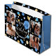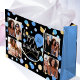 Skapa en snyggt fotokollage-presentväska! Anpassa mallen med fyra favoritfoton, mottagarens namn och födelsedagsålder. En roligt med runda konfektyrer, ballonger och "Grattis på födelsedagen" i ett trendig-skript. Perfekt för familj, barn, vänner och husdjur! Tryckt färg: blått, svart, vitt och guld.