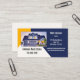 Affärskort med en egen anpassningsbar av dig själv eller ett hus på en geometrisk designbakgrund i benvit, och mörk blått.