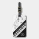 Modern märkre med snyggtens bagage-ID med piano tangentbord och musik noter i svart och vit personlig med ditt monogram och namn i ett handskrivet skript och din kontaktinformation på baksidan. ÄNDRINGAR: Du kan ändra den vita bakgrunden färg eller textteckensnittet stil, färg, storlekt och placerat genom att klicka på CUSTOMIZE YTTERLIGARE om du vill se anpassningsbarna eller helt enkelt ta bort valfri exempeltext om du vill lämna området tomt. Kontakta designern via Zazzle-Chattan eller makeitaboutyoustore@gmail.com om du vill att designen ska ändras eller på en annan produkt.