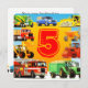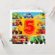 Nio ljusfärgade lastbilar omger ett underbarare stort nummer 5! Lägg till din egen ålder och namn! En cementblandare för grönt och gult, blå plocka upp lastbil, gult, , orange, rulle lastbil, grönt, dragbil och släpvagn, stor röd eldbil, gult och en byggares röda lastbil! Alla slags transporter, de stora lastbilar som barn kärlek! På en ljusblå och gult bakgrund skapar du en mycket färgstark inbjudan eller ett meddelande om roligt. Perfekt till elden lastbil, gräsklippare, lastbil eller traktor som är 5 år gammal på sin femte födelsedag. Underbart för din 5-årige Lastbil ThMeed-Födelsedagsfest. Barn i kärlek, Lastbilar, diggare och traktorer och femåringar i verkligen kärlek. Moderna födelsedagsfester, tillbehör, party favors och gåvor för barn i barnens byggnad och temat lastbil. Alla formgivningar och illustrationer av lastbil © Paul Stickland