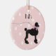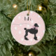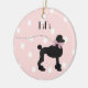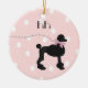 Roligt runt Julgran ornament utförd i rosa med vitt polka dots. Bilder av en svart pudel, med rosa leasing och båge dekorerar ornamentens framsida och baksida. Anpassa med ditt sällskapsdjur pudel namn för en charmerande helgdag-prydnad.