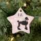 Roligt stjärnformad Julgran ornament utförd i rosa med vitt polka dots. Bilder av en svart pudel, med rosa leasing och båge dekorerar ornamentens framsida och baksida. Anpassa med ditt sällskapsdjur pudel namn för en charmerande helgdag-prydnad.