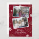 Röda God jul-kort med anpassningsbar som innehåller snöflingor och presenter på röd bakgrund med handskrivna skript. Du kan enkelt anpassa de här jokerkorten med bilder och text.