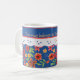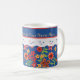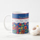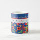 En söt vit keramisk kaffe Mugg för att anpassa sig, med nostalgisk känsla och en Blommigt mini-print mönster på en djup blå bakgrund, trimmad med vit Snöre-effekt. En del av Posh & Painterly 'Granny Print'-samlingen. Den här mixen'n'match handmålad papper collage mönster kan enkelt justeras för att passa vilken Mugg som helst.