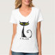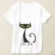 Den här personligen har kvinnans T-shirt-skjorta V-nacke en modern "atomic" black cat med stor gult ögon och ett grå svan. Du kan enkelt ändra textstavningen. Teckensnittet stil, färg och storlekt med knappen Zazzle Personalize.