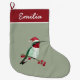 Anpassningsbar julstrumpor med en ruby-throated hummingbird som bär en julhatt på gröntens bakgrund.