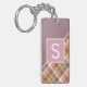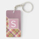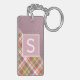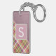 Contemporary rosa röd, grönt, orange och vit tjärtan plaid, och en bakgrund av faux läder struktur mönster. Med utrymme att anpassa eller anpassa sig med ett namn-monogram eller ett första alternativ. Vackra, moderna och coola nyckelkedjor eller resvätebricka för den trendavundsjuka och konstälskande höftledaren, artsy motif älskare.