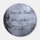 En anpassningsbar magnet med Save the Date in black grungy script and room for the bride and groom namn, date and location in black gothic brev against a spooky Halloween himlar with misty träd längs en mörk hemlig väg, ravens and a cloudy fullt måne with a blue tint.