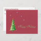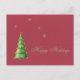 "Glad helg" vykort med röd papper bakgrund med dekorerat träd och snöflingor. Två linjer av anpassadets text på baksidan.