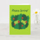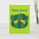 Mottagningskort i vår med vismisk tecknad som illustrerar att röda stegar kryper över grönt löv i olika skuggor över ljust grönt bakgrund. Detta visitkort har anpassadet "Lycklig Vår!". Det kommer att vädja till en älskare-flicka som tycker om vår och färg grönten.