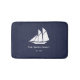 Detta midnattsblå badmat har en vit segelbåt och en ställe för att anpassa badmattan med anpassningsbar som till exempel en familjetext namn och år. Texten är vit. Texten kan redigeras eller tas bort.