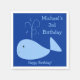 En söt blåval med en vatten-spout simmar förbi för att önska en speciell pojke eller flicka, Grattis på födelsedagen. Anpassa och fyll bara i ditt barns namn och år för att slutföra den visuella designen. Ljusblå fisk på mörk blått bakgrund. Behålla, ändring eller strykning av en formulering.