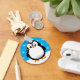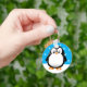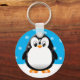 En söt svart och vit penguin teckning. Baby djur nyckelringar. Snö flingar i bakgrunden. Gift-idé för barn.