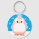 En söt rosa penguin teckning. Baby djur nyckelringar. Snö flingar i bakgrunden. Gift-idé för barn.