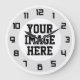 Anpassningsbar, skapa din egen väggklocka. Klocket är fördesignat med siffror och halvgenomskinlig cirkulär grafik under. Lägg helt enkelt till ett eget foto, en egen bild eller text för att skapa din unika väggklocka. Svart nummerdesign - det ser bäst ut när bilden du lägger till är ljusare.