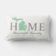 Snyggtens välkomstkudde innehåller texten "Home" med Michigan State karta och anpassningsbar som kan vara personlig med din familj namn och staden, där du bor. Hjärtstadsmarkören kan flyttat till lämplig plats via Anpassad. Vågrät rand klär sig på motsatt sida. Grått-, sylt-/myntform-grönt och vitt färg.