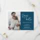 Den här snyggten och den senaste Spara datumutformningen för platta kort kan enkelt anpassas med förlovningens foto, brud och rums webbplats namn, bröllop, plats och bröllop. Anpassa det här magnetkortet i bröllop spara datum och dina spännande nyheter. Blåmotiv.