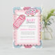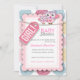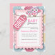 En anpassningsbar babydusch inbjudan för en flicka med uggla, snöre och etikett och stor blomma i många färger