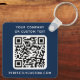 Nyckelkedja på dubblan med anpassningsbarnas logotyp, QR-kod och anpassningsbar på en mörk blått bakgrund eller färg anpassningsbar. Ändra typsnitt och teckensnitt färg, flytta och ändra storlek på inslag med verktyg.