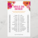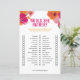 Förhöj din bröllopsfest med vårt personliga "Would She Rather"-spel. Detta underbara och anpassningsbara spel låter gästerna gissa den blivande brudens favoriter, från att stanna hemma jämfört med att gå ut till varmt väder jämfört med kallt väder. Prydd med vacker blomsterkonst är detta spel ett charmerande tillägg till alla bröllopsfester eller möhippor. Lätt att redigera för att passa din unika stil, det lovar skratt och kul för alla. Beställ ditt idag för att skapa minnesvärda ögonblick på din bröllopsfest.