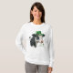 Långärmad t-shirt för St. Patrick's Day med en vattenfärgsbild av en svart och vit ko i grönten top hat med ett guld-band och en vit blomma och schampar. Ett fet skript "Lycklig St. Patrick's Day" under bilden med en enda grönt schysst till ordningens höger. Skriptet kan ändras till din inställning. Ytterligare stilar finns tillgängligt. Bilden kan behöva justeras för olika storlekar.