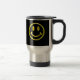 ansiktetravel mug med gult lyckligt ansikte på svart bakgrund. Den underbara designen för teman förband till lyckan, glädje, firande eller inspiration. Använd dessa som reser kaffe koppar, som en underbar fars daggåva eller mors daggåvan.