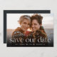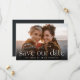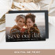 Anteckna att du i stil i oförglömliga dagar i bröllop sparar datumkorten med den här eleganten och det moderna fotot som innehåller ett vågrät eller ett landskapsinriktat foto i fullt med "spara datumet" överlagt med vita bokstäver längs grund. Din namn, bröllop-datum och bröllop-plats visas under modern text. Anpassa baksidan med ytterligare information, t.ex. webbplatsen bröllop.