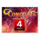 Det här är ett färgstarkt årskort för anställda på 4 år med texten "CONGRATS", som är skrivet i ett roligt med lite snabb inslag och överlagt med en gult till djup röd gradient med en aning digitalt skapat glatta stjärnor och punkter med detaljer. Texten ställs in mot en spännande högtidlig spray av fyrverkeribakgrund med en färg-palett som matchar texten. Under GRATULERAR är en banderoll med texten "4 ÅR". OBSERVERA: gnistran i den här utformningen har skapats digitalt, det kommer inte att finnas något glitter eller någon ytterligare struktur i det slutliga tryckta kortet. Natalie Kinnear Cards