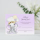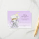 Den berömvärda flicka-elefanten med en söt elefant som flyger i en gult luftballong med vitt moln. Lila och vit övertoningsbakgrund. Mallar som du kan använda för att skapa dina spelkort både framtill och baktill.