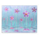 En digital teckning av söt stiliserad lila blommor med strålande röda centrum. De kissar på dig från det höga gräset bredvid en bassäng av tydligt upprivande vatten.