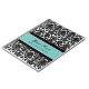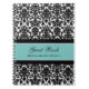 Den spiral anteckningsboken för bröllopgästboken i turkosblått, blom- damastast mönster för svartvit klassiker, med anpassadetext som tillfogar ditt egna namn och bröllop, daterar.