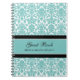 Den spiral anteckningsboken för bröllopgästboken i turkosblått, blom- damastast mönster för svartvit klassiker, med anpassadetext som tillfogar ditt egna namn och bröllop, daterar.