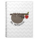 En spiral anteckningsbok som presenterar en illustration av en sloth som hänger från en äppleträdgren med ett rött äpple. Personifiera namn. Bakgrund är den gråa sparren. Sök efter att matcha objekt på den rosa schoolhousen.