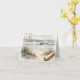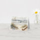 En lugn akvarell kustscen visar mjuka vågor som sköljer mot en sandstrand, kantad av höga gräs, medan en segelbåt driver på den avlägsna horisonten under en molnig himmel, med ett rullat hörn på papperet