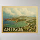 Antigua-design i Vintage resor stil med en tropisk öscen med hav och blå himmel.