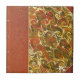 Antik bokband i läder med utsmyckad spiralformad virvelmönster.