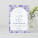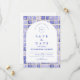 En tidlös blå och vit design inspirerad av klassiskt Delft-porslin och franska toile-mönster. Kanten med patchworkplattor kombinerar ömtåliga blommor, ränder och ornamentala motiv som framkallar europeisk keramik från svunna dagar. En mjukt välvd panel i mitten håller layouten raffinerad och elegant samtidigt som den tillåter detaljerna i det porslinsinspirerade mönstret att ramma in firandet vackert. Perfekt för par som planerar ett sofistikerat blått och vitt bröllop med traditionell europeisk charm.