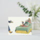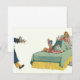 Antik illustration av design för mors dag med pappa som serverar mamma frukost i sängen medan mamma skvallrar i telefonen och hennes dotter leker med en docka i sängen.