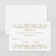 Samla gästsvar i tidlös stil med detta eleganta RSVP-kort omgivet av utsmyckade antik guld scrollwork. Den klassiska designen har sofistikerad serif-typografi och ett graciöst skript svarsdatum mot en ren vit bakgrund. Formatet för accepterar och beklagar ger en förfinad, traditionell känsla. All text är helt redigerbar för att passa dina bröllopsdetaljer.