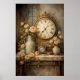 En antiklikocka omgiven av mjuka rosor och vintage dekorativa element i varma neutrala toner. Kompositionen skapar en romantisk shabby chic atmosfär med tidlösa blommiga detaljer.