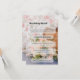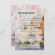 En charmig och nostalgisk design full av struktur. Denna inbjudan visar en vacker bukett av persikofärgade nejlikor, vita rosor och blå accentblommor vilande på en blå sammetsstol. Bakgrunden visar en flätad korgstol och vintage tapet med blommor, vilket skapar en vacker "French Country" eller "Shabby Chic" estetik. Den är perfekt för trädgårdsbröllop, brud shower eller vårens tebjudningar.