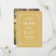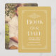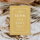 Meddela din bröllopsdag med detta eleganta "spara datumet"-kort som är designat för att se ut som ett vintage bokomslag i en djärv gul senapskulör. Den utsmyckade dekorativa ramen med eleganta hörndetaljer inramar den djärva "Boka vår dag" typografin med sirliga kalligrafiska accenter. Paret namn, datum och plats presenteras i förfinad crèmfärgad text, med baksidan med ett fullständigt förlovningsfoto. Ett perfekt val för bokälskare och litterära bröllop. All text och foto är helt redigerbara.