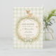En mjuk skogsbabyshowerdesign med en delikat akvarellfawn som står ovanför en blomsterkrans i skogen. Lugn grönska, små svampar och vilda blommor omger mitten, medan en mjuk salvia-rutig bakgrund och ett band i en rosett lägger till en mysig lantlig barnkammare-känsla. Den vintage sagoboksillustrationsstilen och den dämpade skogspaletten skapar en elegant och fantasifull design perfekt för en naturinspirerad fest som välkomnar en ny bebis.