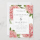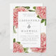 En snygg blommig bröllopsinbjudan med vintagekänsla, perfekt för vår eller sommar. Denna design har fyra stora botaniska rosa peonior i akvarellstil med gröna blad, på en krispig vit bakgrund. Texten är i klassisk mörkgrå färg.