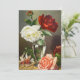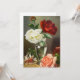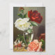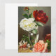 Antik illustrativ botanisk naturdesign med vita, rosa och röda blommande trädgårdsrosor i en klar glassvas.