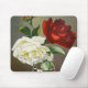 Vintageillustration botanisk naturdesign med vita, rosa och röda blommande trädgårdsrosor i en klar glassvas.