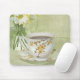 Gamldags tekopp på en saucer med te och daisy bouquet.