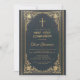 Denna blå, eleganta första kommunion-inbjudan med vintage-känsla, lämplig för en pojke, har en förgylld vintage ram med eleganta barocka förgyllda dekorationer på en mörkblå läderliknande bakgrund. Barnets namn skrivs med en elegant kalligrafisk skrift. All text kan anpassas och har en gyllene färg liknande ramens förgyllda dekorationer.