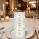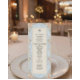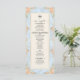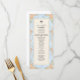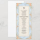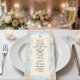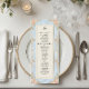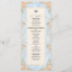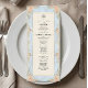 Transporter dina gäster till en romantisk era med denna rokokoinspirerade design med akvarellblommor och keruber. Perfekt för en sagolandskapsmottagning. Denna design har en frodig, romantisk komposition centrerad runt en mjuk, ljusblå bakgrund som simulerar en tryckt marmorerad textur. Kanterna är prydda med en utsmyckad, falsk guld filigranram i barockstil, sammanflätad med akvarellillustrationer av persikoröda rosor, krämfärgade prästkragar och salvia gröna ormbunkar. Överst avbildas lekfulla keruber som spelar fiol, på varsin sida om en klassisk illustration av en serveringsklocka. Texten är arrangerad i en traditionell hierarki med elegant, sotgrå serif-typografi och ett fl
